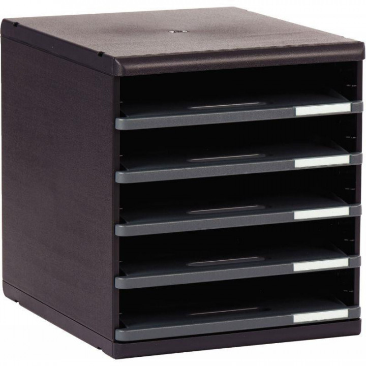 Module 5 tiroirs ouverts MODULO noir. Système de classement élégant et fonctionnel pour documents au format A4+.- Modules de hauteur identique à celle d'un classeur à levier, superposables et juxtaposables (MODULO A4 & A3 combinables).- Tiroirs ouverts permettant l'introduction directe de documents sans ouvrir les tiroirs.- Coulissement parfait des tiroirs, avec butée de sécurité, poignée confortable et porte-étiquette.- Livrés avec tous les clips et obturateurs nécessaires au montage et à la finition.Garantie 25 ans