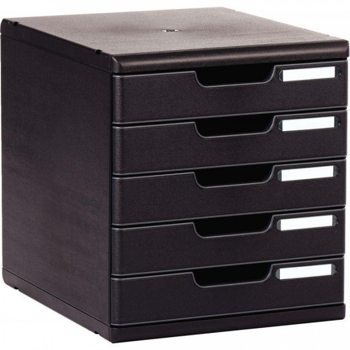 Module 5 tiroirs MODULO noir. Système de classement élégant et fonctionnel pour documents au format A4+.- Modules de hauteur identique à celle d'un classeur à levier, superposables et juxtaposables (MODULO A4 & A3 combinables).- Évolutif grâce à 4 hauteurs de tiroirs (26, 54, 82 & 110 mm) interchangeables 4/3/2/1.- Coulissement parfait des tiroirs, avec butée de sécurité, poignée confortable et porte-étiquette.- Livrés avec tous les clips et obturateurs nécessaires au montage et à la finition.Certifié Ange Bleu car réalisé à partir de bouteilles de jus de fruits recyclées.Garantie 25 ans