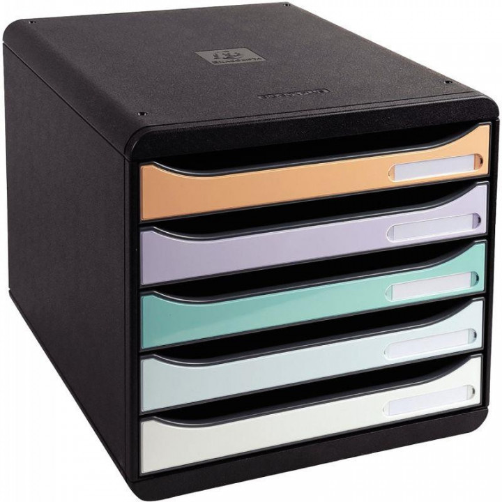 Module 5 tiroirs BIGBOX+ noir/pastel. Caisson individuel à 5 tiroirs pour documents au format A4+. Monobloc, ultra-rigide. Superposable grâce à 4 reliefs prévus à cet effet. Tiroirs ouverts permettant l'introduction directe de documents sans ouvrir les tiroirs. Coulissement parfait des tiroirs, avec butée de sécurité et porte-étiquettes (fournis). Fourni avec un jeu d'étiquettes Lundi à Dimanche
