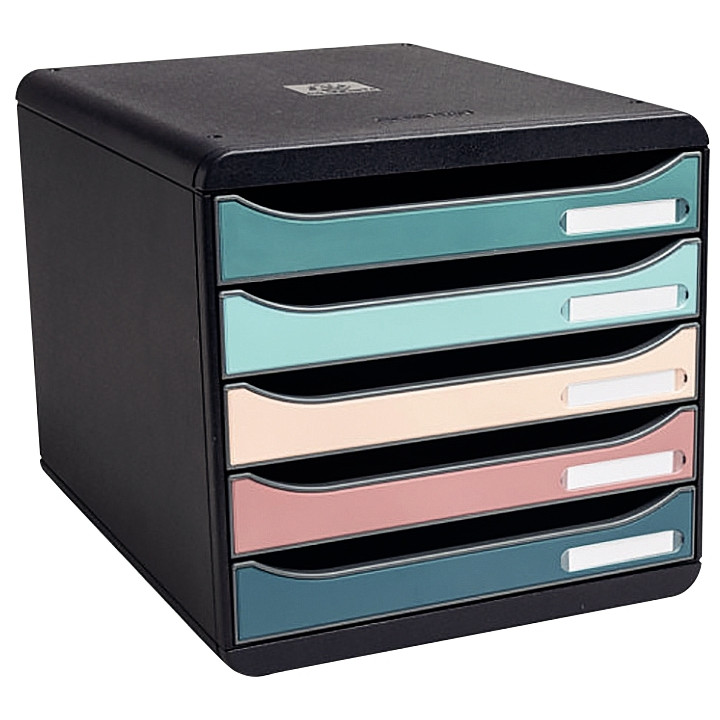 Module 5 tiroirs BIGBOX+ Skandi. Caisson individuel à 5 tiroirs pour documents au format A4+. Monobloc, ultra-rigide. Superposable grâce à 4 reliefs prévus à cet effet. Tiroirs ouverts permettant l'introduction directe de documents sans ouvrir les tiroirs. Coulissement parfait des tiroirs, avec butée de sécurité et porte-étiquettes (fournis). Fourni avec un jeu d'étiquettes Lundi à Dimanche