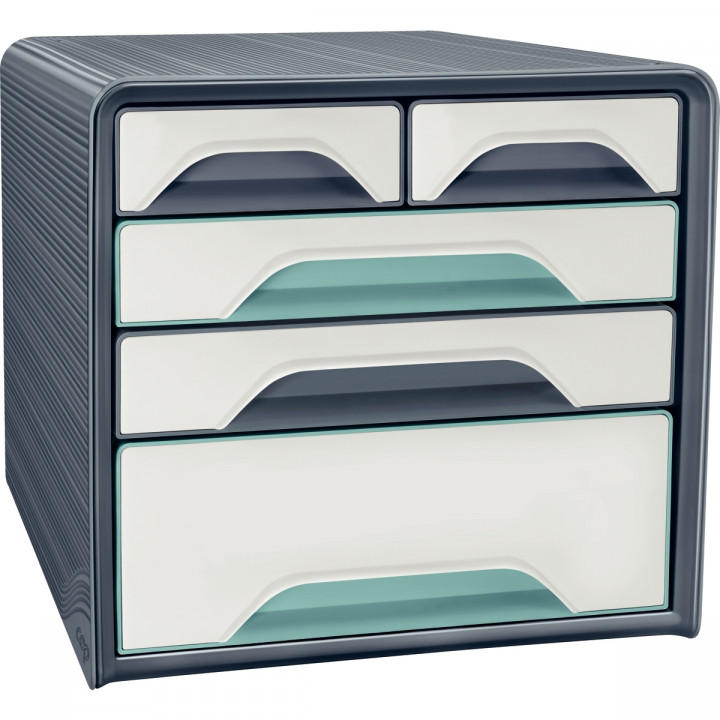 Module 3+2 tiroirs SMOOVE Riviera. Bloc de classement agrémenté d’un texturage en relief pour une finition contemporaine et raffinée. Caisson monobloc très robuste. Superposition parfaitement stable sur plusieurs niveaux. Trois tailles de tiroirs permettent de rassembler toutes les petites fournitures de bureau, les dossiers jusqu’au format 24x32cm et les accessoires encombrants type disque dur externe, chargeurs… Tiroirs interchangeables (à l’exception de ½ tiroirs) permettant un agencement personnalisable. Equipés de poignées ergonomiques, d’un trou de préhension pour faciliter la saisie du contenu et de stop tiroir. Disponibles en coloris opaques pour préserver la confidentialité du contenu et en coloris transparents pour visualiser rapidement le contenu. Capacités utiles : ½ tiroir 322 x 108 H 37 mm, tiroir standard 322 x 244 H 40 mm, maxi tiroir 322 x 244 H 85 mm. Patins antidérapants fournis. PS résistant, 100% recyclable. Dim. hors tout 360 x 288 H 271 mm.