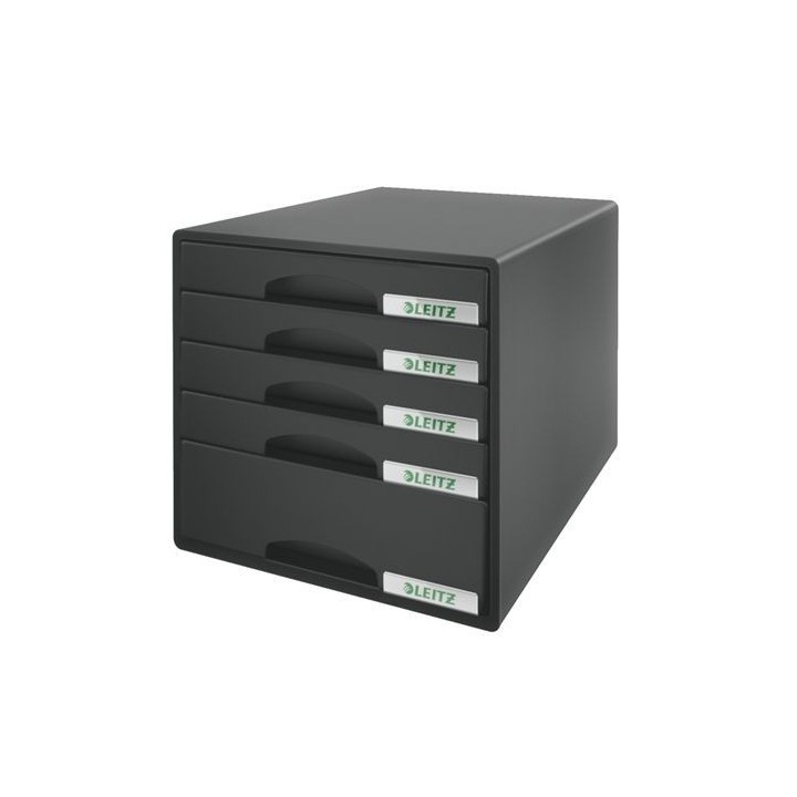 Bloc de classement 5 tiroirs très résistant, 4 petits tiroirs pour accueillir les documents et petit matériel de bureau. Le grand tiroir permet de stocker les accessoires de bureau plus encombrants (agrafeuse, appareils mobiles, etc.). Les tiroirs à glissement facile sont munis d'une butée d'arrêt. Une pression suffit pour fermer le tiroir. Fourni avec un porte-étiquette à clipser et des étiquettes. Encoche ergonomique pour une ouverture facile. Dim : 28,7 x 27 x 36,3 cm.
