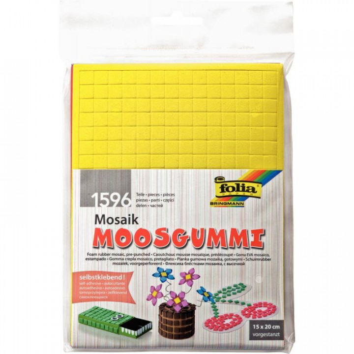 Sac de 6 feuilles mosaïque mousse 15 x 20 cm adhésives. 1596 pièces de mousse 1 cm x 1 cm prédécoupées adhésives en 6 coloris assortis. Les feuilles de taille 15x20 cm ont une épaisseur de 2mm. Les enfants peuvent alors facilement embellir des boites ou des objets dans les couleurs de leur choix. A partir de 3 ans