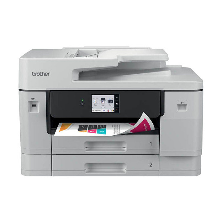 Multifonction 4 en 1 jet d'encre MFC-J6960DW. Votre imprimante multifonction jet d'encre A3 sans fil. La MFC-J6960DW offre l'impression, la numérisation, la copie et le fax A3 haut de gamme dans un appareil jet d'encre robuste. Dotée de la technologie MAXIDRIVE, elle assure des vitesse d'impression rapides et une qualité constante. Caractéristiques principale : •Impression, numérisation, copie et fax au format A3 •Tête d’impression durable MAXIDRIVE •Jusqu’à 31 images par minute¹ •Écran tactile couleur de 8,8 cm (3,5") •Ethernet Gigabit, WiFi5 GHz et USB •Impression et numérisation vers un PC ou via application mobile et USB •Bac d’alimentation papier de 500 feuilles, bac multi-usages de 100 feuilles, chargeur automatique de documents (ADF) de 50 feuilles •Bac de sortie papier de 100 feuilles •Livrée avec cartouches de démarrage : 700 pages en noir, 450 en couleur, rendement maximum disponible de 6 000 pages en noir, 5 000 en couleur.