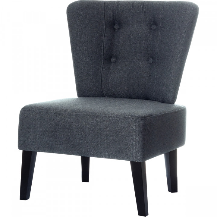 Fauteuil Brighton gris anthracite. Courbes et capitonnage qui lui confèrent un style vintage. Structure : pin massif et aggloméré. Revêtement : tissu 100% polyester non déhoussable, Garniture : mousse recyclée 60kg/m3 + mousse polyuréthane 18 kg/m3. Piètement : hêtre massif. Hauteur d'assise : 41 cm. Profondeur d'assise : 49 cm. Dimensions : H 82 x L 65 x P 64 cm. Garantie 2 ans.
