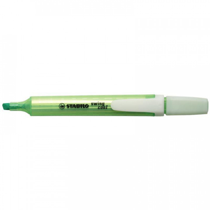Surligneur Swing Cool vert. Encre fluorescente universelle à base d'eau. Habillage effet "givré". Résistance intense à la lumière. Avec agrafe. Pointe biseautée: 2 largeurs de tracé de 1 à 4mm.
