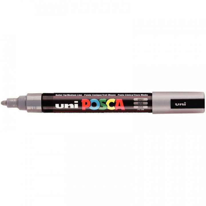 Marqueur Posca pointe moyenne ogive gris. Les couleurs sont denses, opaques, couvrantes, superposables et ne pâlissent pas à la lumière. L'encre est inodore. S'applique sur tous supports : papier, bois, plastique, verre, métal… Peint, dessine, écrit et marque. Pour des applications illimitées.