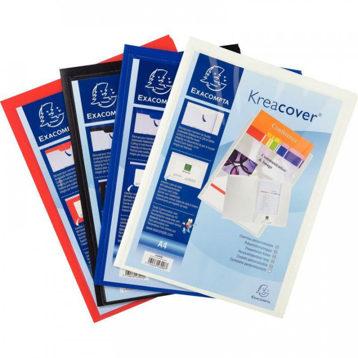 Paquet de 10 chemises personnalisables KREACOVER. En polypropylène 4/10ème. Pour documents A4 (21 x 29,7 cm). 2 rabats intérieurs clipsés. Languette intérieure pour maintien des documents. Personnalisable en 1ère de couverture. Encoche pour cartes de visite. 4 coloris assortis : blanc, bleu, noir, rouge.
