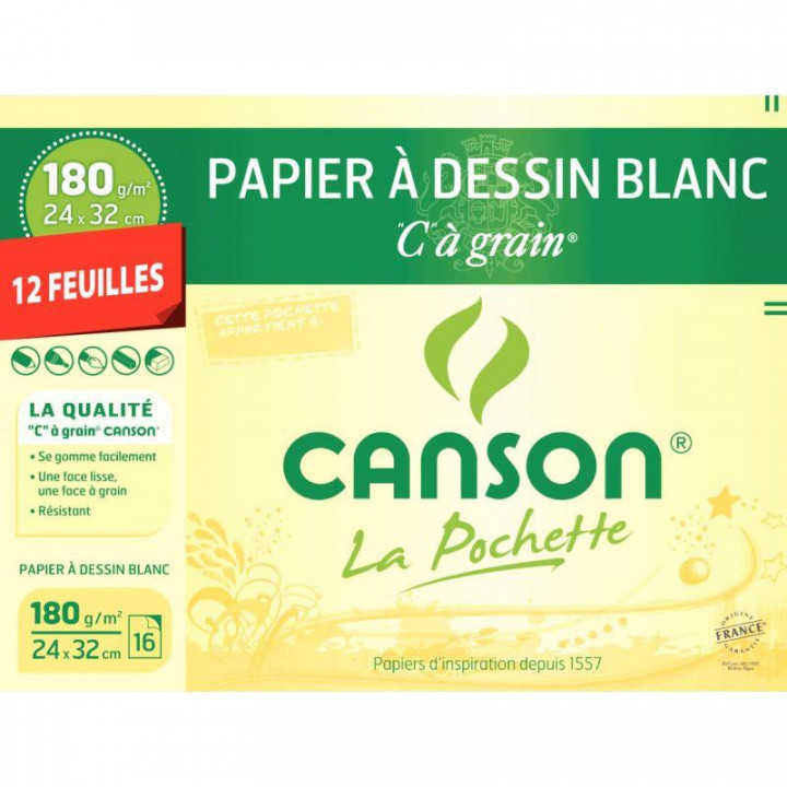Pochette de 12 feuilles à dessin C à grain 180g 24x32cm. Papier à dessin blanc à grain atténué. Pour le crayon, le fusain ( croquis, études ), l'encre et la gouache dans les forts grammages. Identification : marqué à la molette ""C"" à grain."
