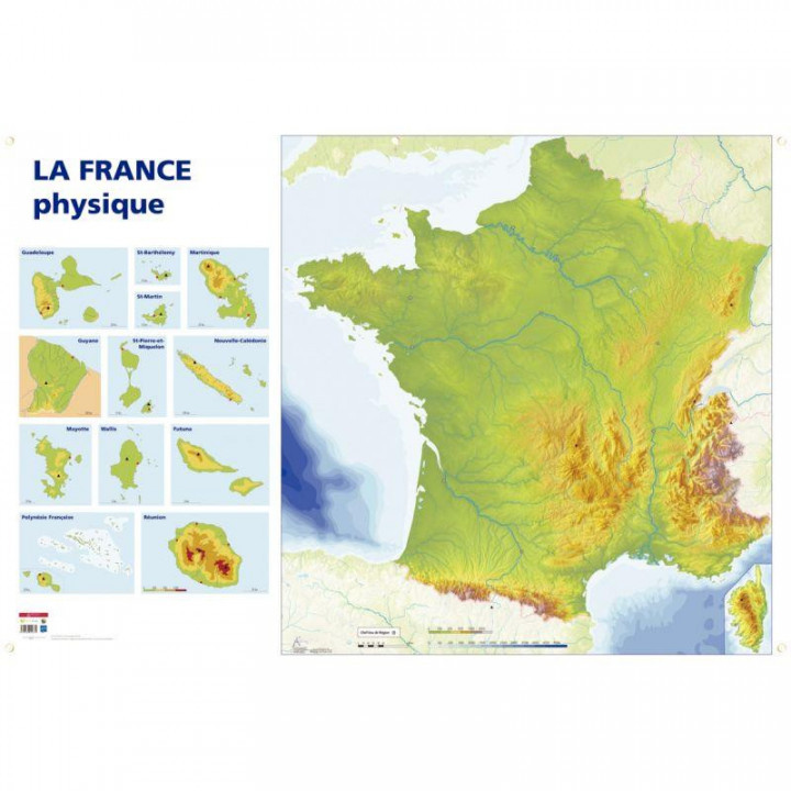 Carte de France physique. Dimensions : 1,20x0.80 mètre. France métropolitaine et Corse.Carte muette avec les régions, les cours d'eau et les fonds marins, conçue pour réunir tout à la fois des informations physiques et politiques. Véritable support de travail dans tous les domaines de la géographie et de l'histoire.Indication discrète des capitales de régions.Impression quadrichromie, plein format.Polypropylène 5/10ème. Indéchirable, insensible aux U.V, lavable.Revêtement effaçable à sec haut de gamme.Avec un espace pour le maître, pour inscrire une légende complémentaire, un commentaire... Avec 5 œillets