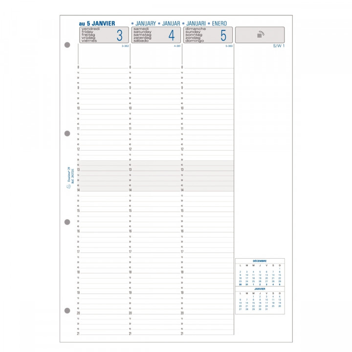 Recharge millésimée Exatime29 12mois blanc. Format : 21 x 29,7 cm. 12 mois de Janvier à Décembre. 1 semaine sur deux pages à la verticale. Papier blanc.
