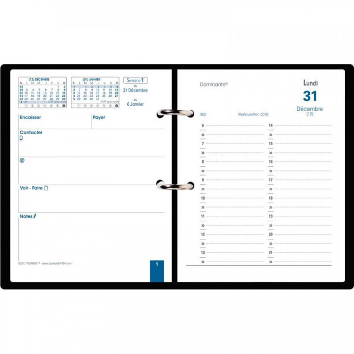 Socle et recharge Planing. Format bloc : 11,5 x 14,5 cm, Format socle : 24 x 17 cm. Socle plastique fumé. Bloc notes de 6 à 21 heures. Présentation "Agenda Planing" 1 jour par page + page notes. 12 mois de janvier à décembre.