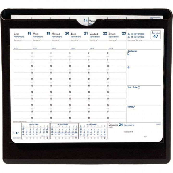 Socle et recharge Blockhebdo. Format feuillets : 19,6 x 14,5 cm. Format socle : 22 x 21 cm. Feuilles détachables pouvant être rangées dans le socle. Bloc "Agenda planing" hebdomadaire. 12 mois de janvier à décembre. Socle design en ABS noir.
