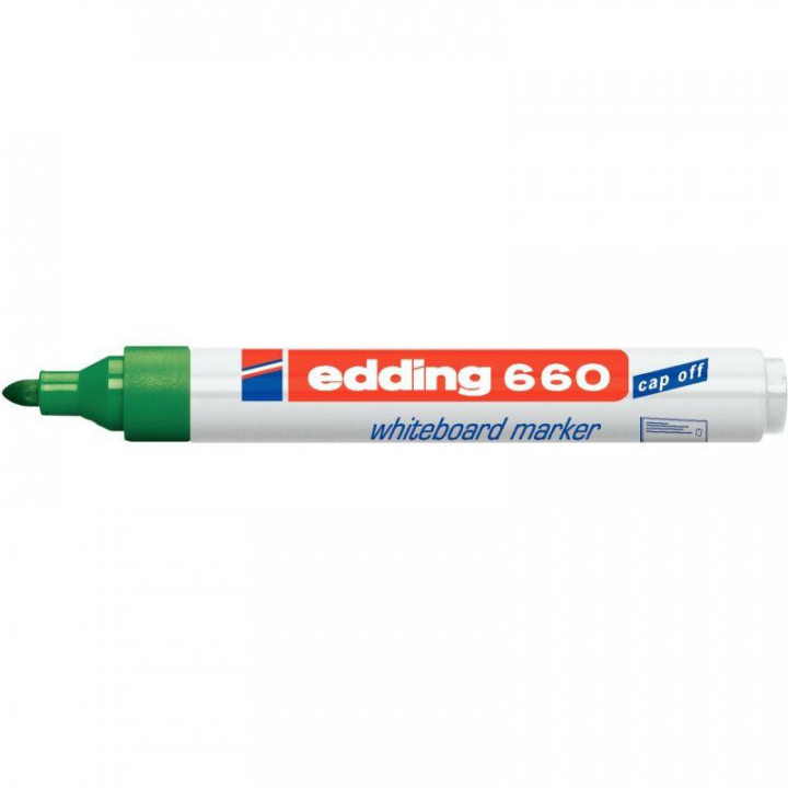 Marqueur tableau blanc E660 pointe ogive vert. Encre résistant à la lumière . Séchage rapide. Effaçable à sec de toutes les surfaces non poreuses. Ecriture souple, couleurs lumineuses .Le produit peut rester quelque temps sans capuchon sans sécher. Encre faible odeur. Largeur écriture de 1,5 à 3mm.