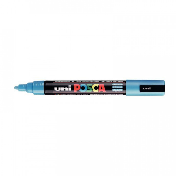 Marqueur Posca pointe moyenne ogive bleu clair. Les couleurs sont denses, opaques, couvrantes, superposables et ne pâlissent pas à la lumière. L'encre est inodore. S'applique sur tous supports : papier, bois, plastique, verre, métal… Peint, dessine, écrit et marque. Pour des applications illimitées !