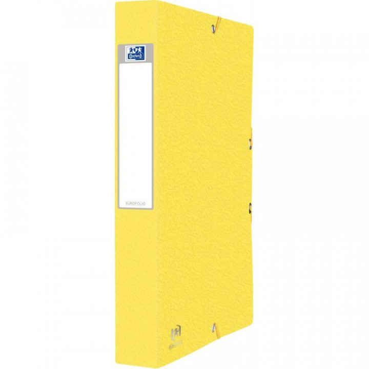 Boîte de classement EUROFOLIO+ en carte grainée, dos 40 mm, jaune. Carte grainée en relief 7/10ème. Format 25 x 33 cm. Étiquette de dos. Fermeture par élastiques. Livrée montée.