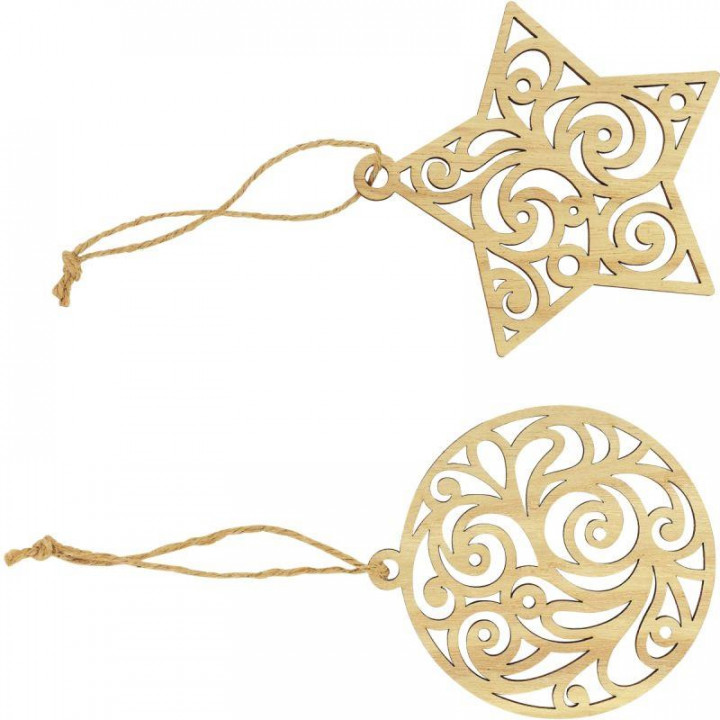 Lot de 12 étoiles et boules art déco en bois. Décorations ajourées. 2 modèles différents à décorer (6 de chaque). Livrées avec une cordelette. Hauteur 11 cm.
