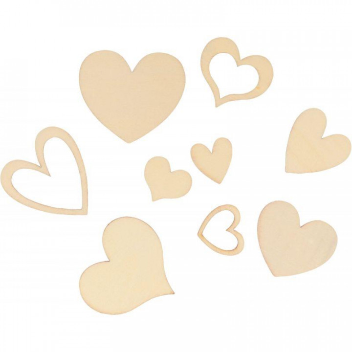 Lot de 129 cœurs en bois brut. de 2 à 4.5 cm