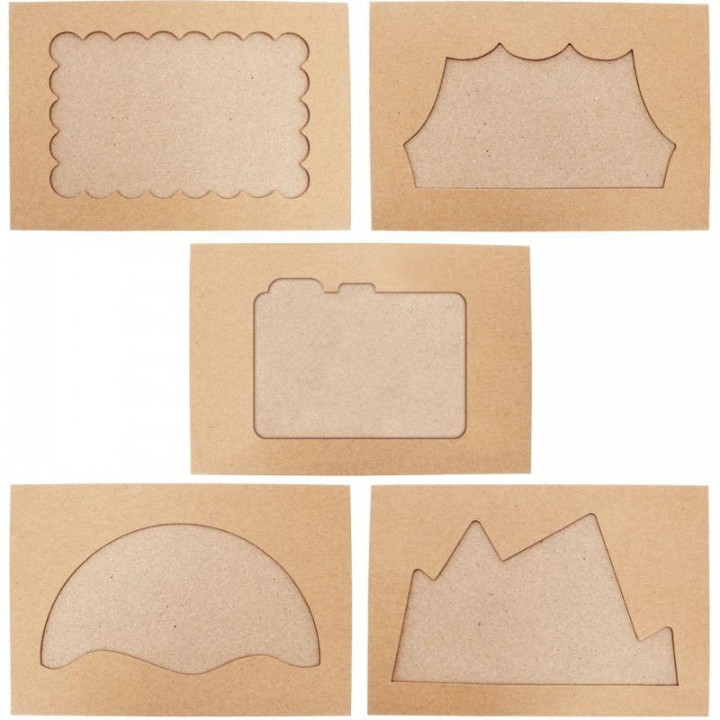 Lot de 10 étuis photo fantaisie en carton. En carton brun à décorer. 5 modèles fantaisie assortis. Pour photo 10 x 15 cm à glisser à l’intérieur comme un étui. Dimensions d’un étui : L.15,5 x l.10,5 cm.