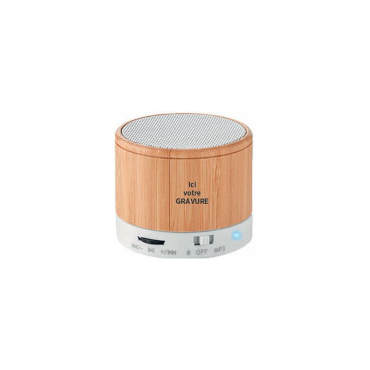 Haut-parleur sans fil 4.2 en ABS avec boîtier bambou. 1 pile rechargeable lithium 450 mAh incluse. Port de carte SD et un câble AUX / USB. Fonction appel mains libres. Sortie : 3W, 3 0 Ohm et 5V. Dim : diamètre 6 x 5 cm.