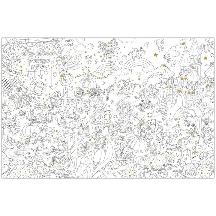 Coloriage 80X120c:m. Pochette 22x30.5cm. Support papier offset 150g/m² certifié PEFC 100%, impression noir (sauf monde féérique impression noir et or), vendu plié dans une pochette carton. Plusieurs enfants peuvent colorier en même temps.