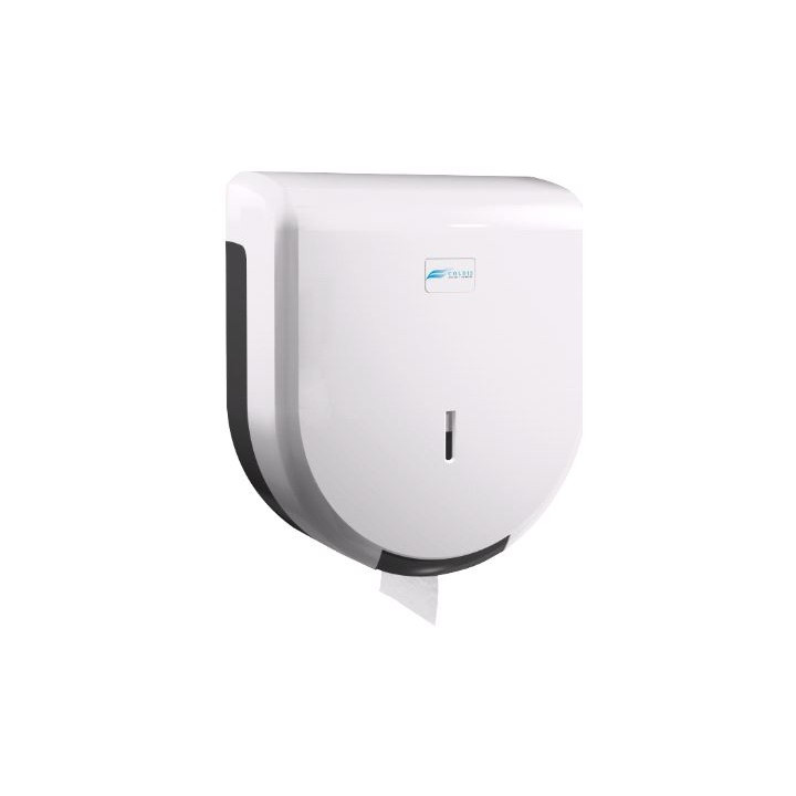 Distributeur en ABS blanc pour tous types de bobines jusqu'à 400 m maximum. Fenêtre de contrôle et fermeture à clé. Dimensions : 28,5 x 12 x 32 cm. Papier toilette pure ouate 2 plis, largeur 9 cm. Bobines compatibles avec tous les distributeurs Jumbo et mini-jumbo.