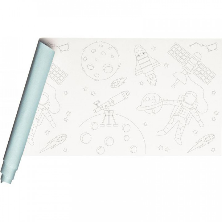 Rouleau fresque à peindre espace. Parfait pour organiser des activités de groupe, entre ami(e)s ou à l'école, et réaliser des fresques géantes à la peinture, aux feutres, aux crayons,... sur un thème précis grâce au motif pré-dessiné répété sur toute la longueur du rouleau. Idéal pour décorer couloirs et salles de classes. 1 face blanche et 1 face bleu. Papier REH (Résistant à l'Etat Humide) Dimensions : 10mx0.5m
