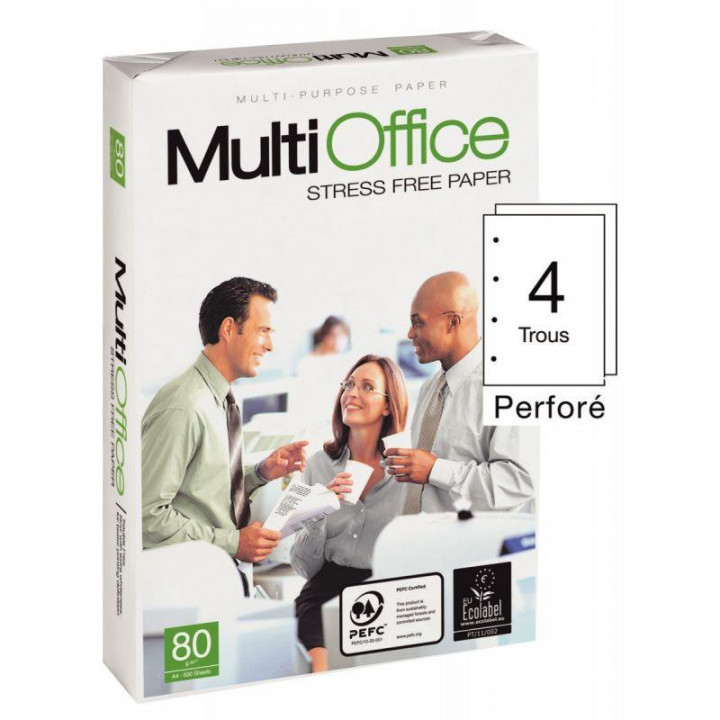 Ramette de 500 feuilles format A4 80g perforée MULTI OFFICE. Le papier reprographique MULTIOFFICE offre des performances optimales d?impression, grande stabilité de feuille et un bon rapport qualité prix. - Bonne blancheur, indice de blancheur CIE : 161 - Bonne opacité - Passage machine garanti pour toutes imprimantes laser et jet d?encre et copieur grande vitesse. Ce papier valorise la communication de votre entreprise. PEFC, ECOLABEL.