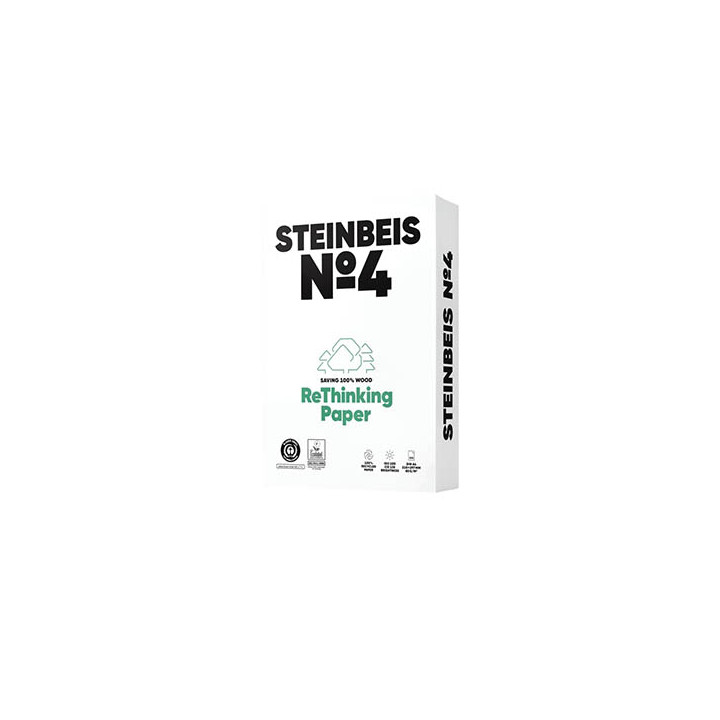 Ramette de 500 feuilles format A3 80g blanc STEINBEIS N°4. Recyclé à partir de 100% de papiers de récupération (journaux et magazines). Pour copieurs, imprimantes laser et jet d’encre. Ce papier de qualité séduit par un blanc brillant et se prête ainsi idéalement à l’impression des rapports annuels et de la correspondance. Indice blancheur = 135 100% recyclé. Certifié fleur européenne, ange bleu.