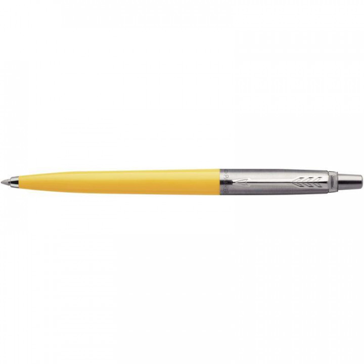 Stylo bille Jotter corps jaune. Corps en acier ou en plastique brillant (pour les versions colorées). Clip en acier inoxydable. Collection inspirée d’un voyage dans les années 90. Encre bleue. Rétractable.