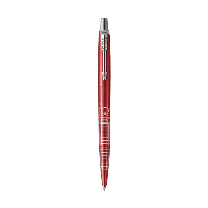 Stylo bille Jotter Londres. Pointe moyenne, rétractable. La ligne d'horizon de chaque ville et le motif sont gravés au laser. Livré en coffret cadeau. Encre bleue.