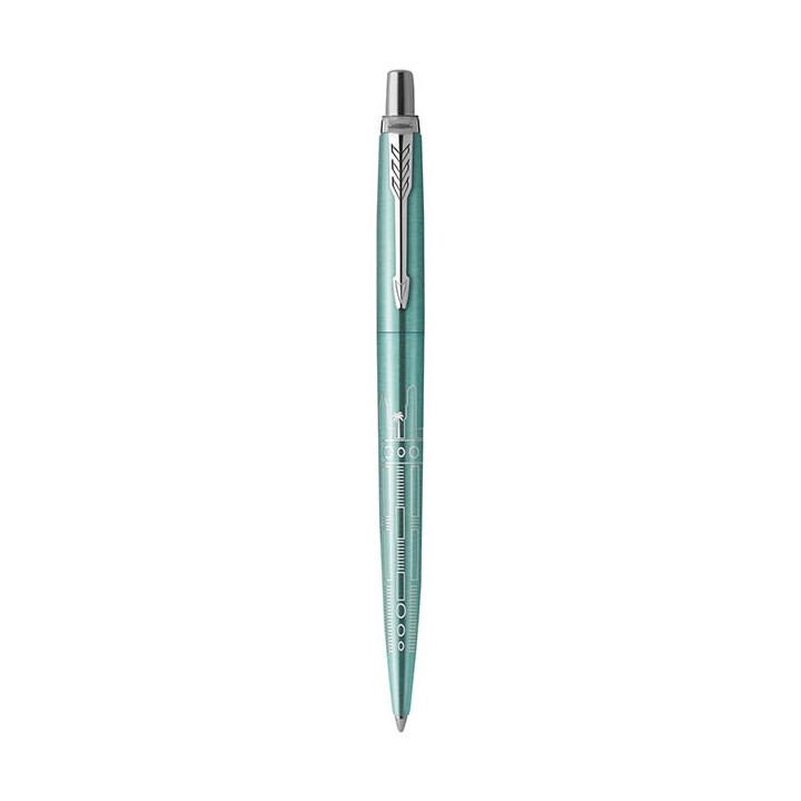 Stylo bille Jotter Miami. Pointe moyenne, rétractable. La ligne d'horizon de chaque ville et le motif sont gravés au laser. Livré en coffret cadeau. Encre bleue.