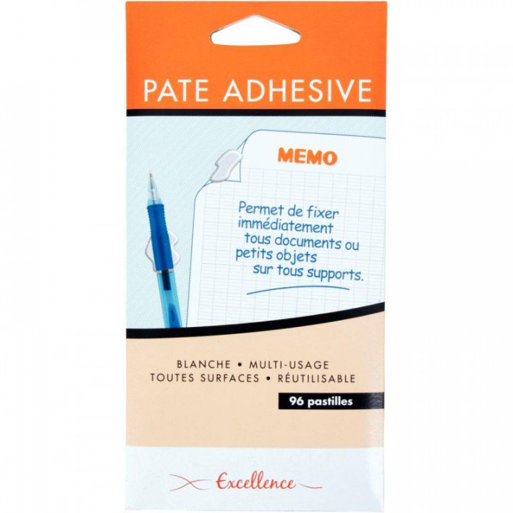 Blister de 96 pastilles adhésives blanches. Réutilisable, multi-usages, s'enlève aisément. Permet de fixer des papiers vinyl et peint, des posters, verre, métal, ciment, bois, plastique, céramique ou toutes décorations mais aussi de maintenir les objets en surface horizontale. Les surfaces doivent être propres et sèches.