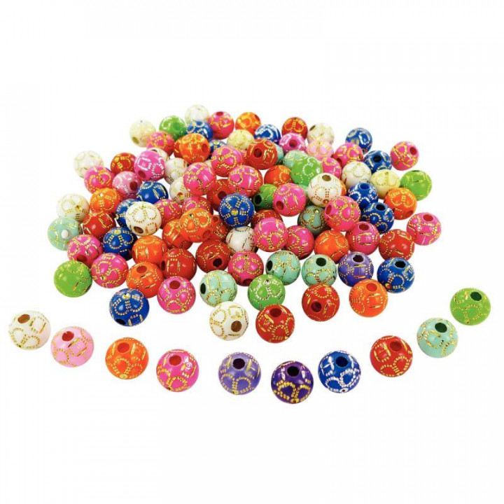Sachet d'environ 500 perles pointillés or. En plastique, coloris assortis. Diamètre : 10 mm.