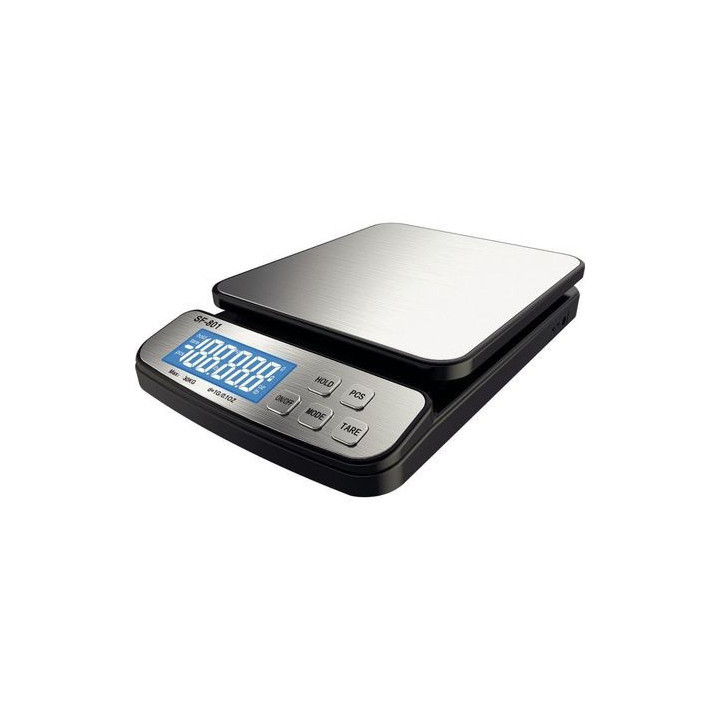 Pèse-colis électronique 30kg. Plateau en inox 19,5 x 18cm Graduation par 1g. Fonctionne avec 3 piles AAA (piles et chargeur fournis). Norme IP23 ( Résistance à l'eau et l'humidité mais non étanche.) Garantie 5 ans.