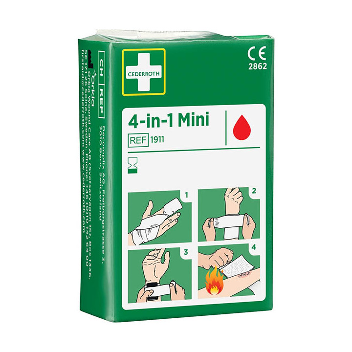 Mini Stop Sang 4-en-1. Le mini Stop-Sang 4-en-1 est un petit pansement souple et stérile spécialement étudié pour les doigts. Des instructions claires et imagées sont imprimées directement sur l’emballage. 4 fonctions : 1. Pansement compressif pour hémorragies importantes 2. Pansement de protection pour blessures superficielles 3. Pansement pour brûlures (surface non-adhérente de la compresse) 4. Attelle temporaire Contient 1 pansement (8 x12 cm) et 1 bande élastique (6 cm x 3 m).