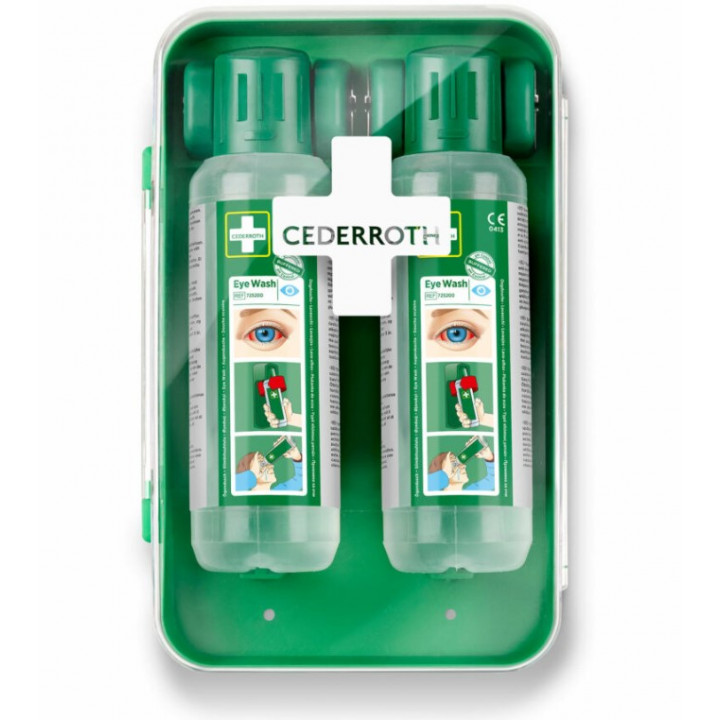 Station de rinçage oculaire équipée. La station de rinçage oculaire permet de porter secours le plus rapidement possible : les bouteilles s'ouvrent automatiquement lorsqu'on les dévisse de leurs supports - ce qui signifie que le rinçage peut commencer immédiatement !