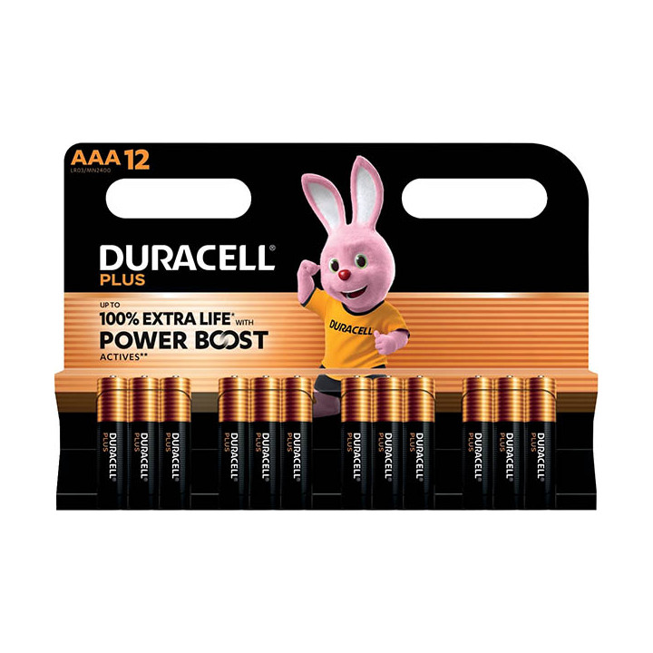 Blister 12 piles 1.5V PLUS POWERBOOST AAA / LR03 / MN2400. PERFORMANCE IDÉALE : Cette pile AAA Duracell est idéale pour alimenter tous vos appareils du quotidien, avec jusqu’à 100 % de durée de vie supplémentaire* grâce aux actifs POWER BOOST. FORMULÉE AVEC DES ACTIFS POWER BOOST : Les piles alcalines Duracell Plus AAA contiennent les actifs brevetés POWER BOOST de Duracell, un mélange unique de lithium et de nickel, qui garantit des performances durables pour vos appareils. FERMETURE SUPÉRIEURE EN NYLON : La fermeture en nylon de nos piles AAA aide à prévenir les fuites. EMBALLAGE DURABLE : L’emballage sans plastique (0 %) des piles est recyclable. DURABILITÉ : Nos technologies permettent de conserver les piles non utilisées jusqu’à 10 ans*** en stockage. *Performance de longévité par rapport à la durée moyenne minimale du dernier test IEC pour jouets utilisant des piles AAA. Les résultats peuvent varier selon l’appareil ou l’usage. (www.iec.ch) ** Technologie exclusive *** Garantie commerciale