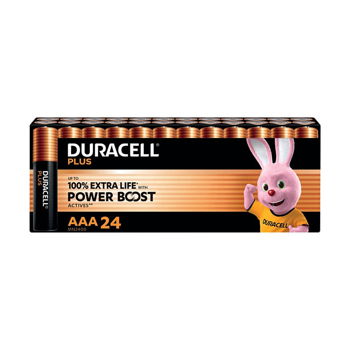 Boite 24 piles 1.5V PLUS POWERBOOST AAA / LR03 / MN2400. PERFORMANCE IDÉALE : Cette pile AAA Duracell est idéale pour alimenter tous vos appareils du quotidien, avec jusqu’à 100 % de durée de vie supplémentaire* grâce aux actifs POWER BOOST. FORMULÉE AVEC DES ACTIFS POWER BOOST : Les piles alcalines Duracell Plus AAA contiennent les actifs brevetés POWER BOOST de Duracell, un mélange unique de lithium et de nickel, qui garantit des performances durables pour vos appareils. FERMETURE SUPÉRIEURE EN NYLON : La fermeture en nylon de nos piles AAA aide à prévenir les fuites. EMBALLAGE DURABLE : L’emballage sans plastique (0 %) des piles est recyclable. DURABILITÉ : Nos technologies permettent de conserver les piles non utilisées jusqu’à 10 ans*** en stockage. *Performance de longévité par rapport à la durée moyenne minimale du dernier test IEC pour jouets utilisant des piles AAA. Les résultats peuvent varier selon l’appareil ou l’usage. (www.iec.ch) ** Technologie exclusive *** Garantie commerciale