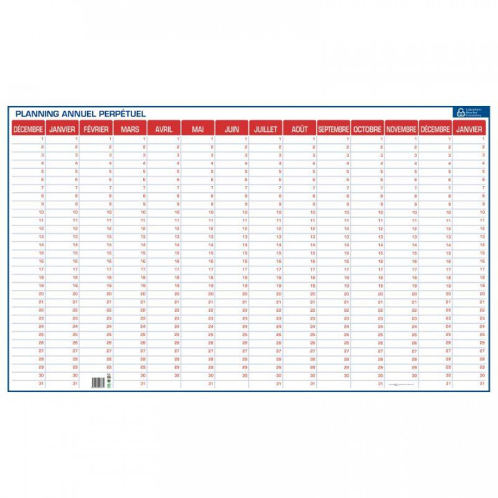 Planning 14 mois perpétuel souple. Effaçable à sec. De décembre à janvier. En PVC 400g. Dim: H60xL99cm.