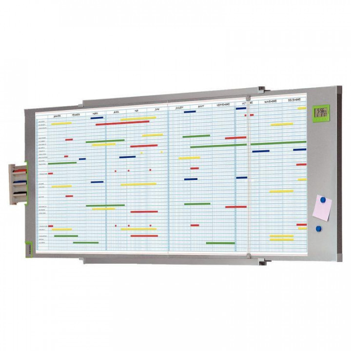 Planning 12 mois perpétuel rigide. Magnétique, effaçable à sec. Capacité de 80 lignes par mois (40 lignes doubles). Composé de 2 panneaux sérigraphiés avec glissières de fixation murale. Auget porte-marqueurs. Bande coulissante magnétique. 1 ruban adhésif. 3 marqueurs. Dim: H60,5xL185cm. Visserie et fixation fournies.