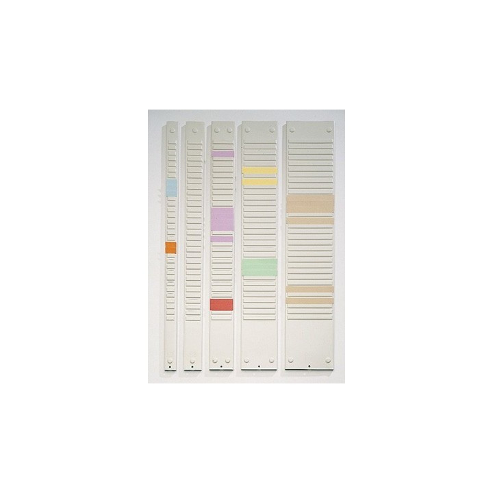 Bande profilée en tôle d’acier pourvue de fentes destinées à recevoir des fiches T. 2 largeurs de bandes affectées d’un indice correspondant à la largeur de fiche T. 3 hauteurs suivant le nombre de fentes.