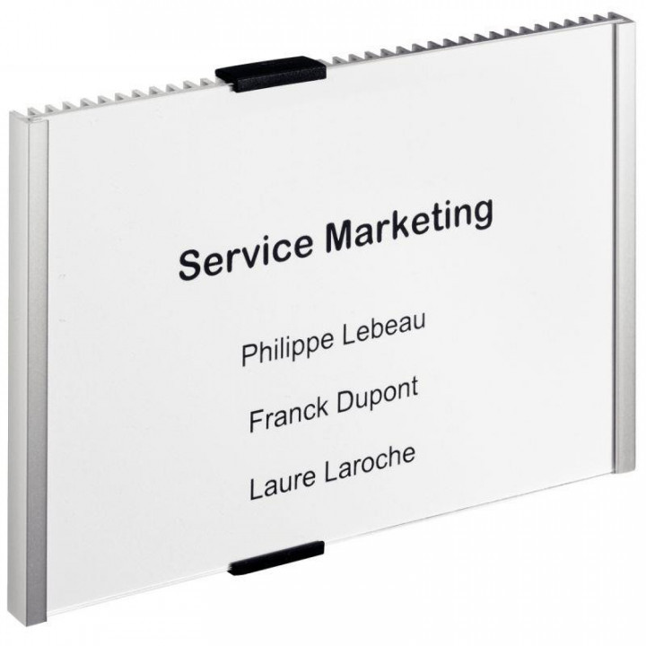 Plaque de porte INFO SIGN 210x148.5mm Argent Métallisé. Signalisation intérieure, conçue en aluminium avec façade de protection amovible en acrylique antireflet de 2mm.Livrée avec vis ou pastilles adhésives double face.Les planches d'étiquettes sont personnalisables par ordinateur => logiciel téléchargeable sur : www.durable.fr