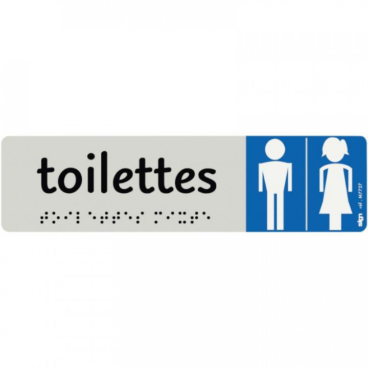 Plaque aluminium de signalisation avec texte en braille Toilettes Hommes Femmes format 170 x 45 mm. Plaque aluminium de signalisation avec texte en braille "homme/femme". Utilisation intérieure. Impression sérigraphique. Gravées chimiquement. Aluminium semi-brillant. Alliance texte et logo de couleur très visuelle. Épaisseur 0,5mm. Fixation autocollante. Texte en braille. Dimension : 170 x 45mm.