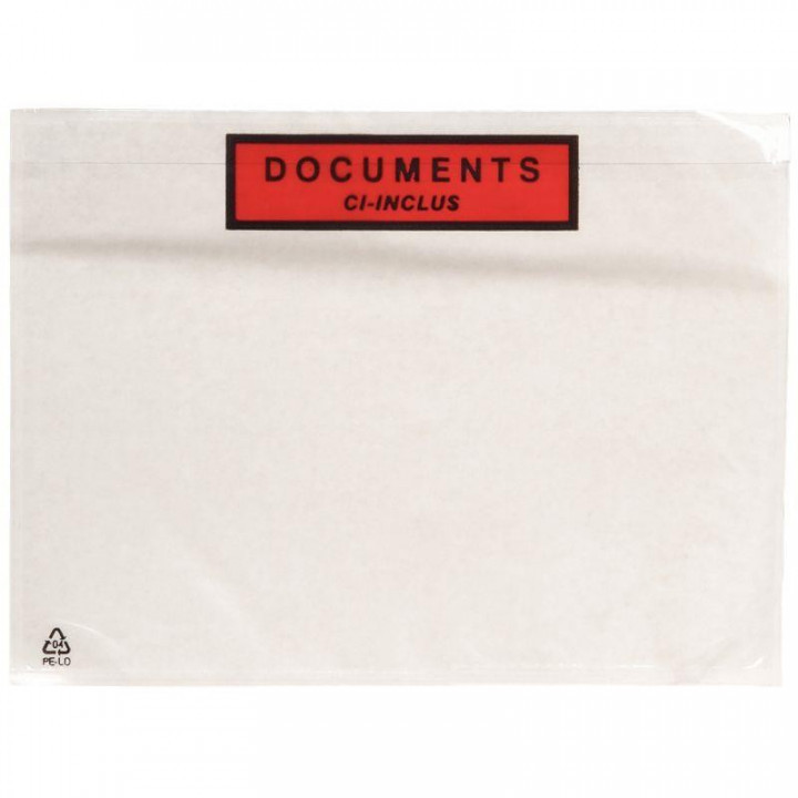 Boite de 1000 pochettes adhésives "documents ci-inclus" 228x165mm. Pour la signalisation de vos colis et la protection de vos documents d'accompagnement (courrier, bordereau de livraison, ...).