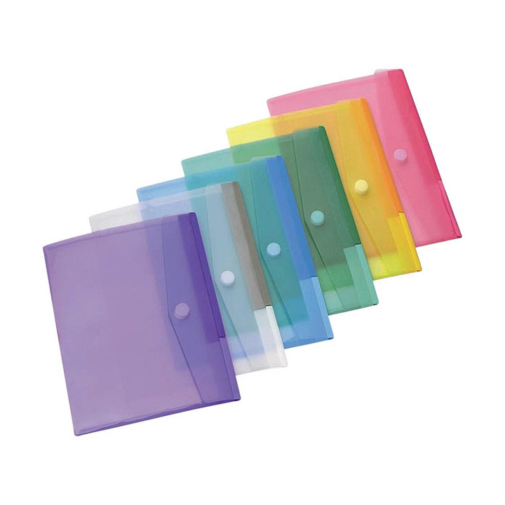 Paquet de 12 enveloppes en polypropylène pour format A4, coloris assortis. Enveloppe fermée par un velcro, en polypropylène 18/100ème translucide, lisse et brillant. Idéale pour ranger, protéger et transporter vos documents, chéquiers, cartes de visites, badges, tickets restaurants, billets de voyage, etc. Format extérieur 24 x 31,6 cm. Capacité 70 feuilles. 6 coloris pastel assortis : bleu, violet, vert, jaune, rose et incolore.