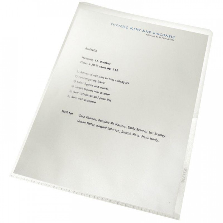 Boite de 100 pochettes coin en polypropylène recyclé 14/100ème, incolore. Fabriqué à partir de polypropylène recyclé à 90% et 100% recyclable. Pour format A4 (21 x 29,7 cm). Aspect grainé. Incolore. Copy safe : imperméable à l'encre et matériau sans acide empêchant le papier de jaunir.