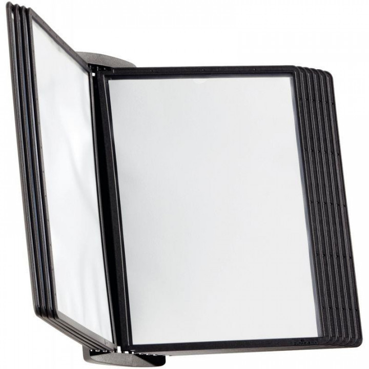 Support SHERPA STYLE 10 pochettes. Système de consultation design et fonctionnel composé de 10 pochettes (soit 20 vues).? Kit composé d'un support mural, de 10 pochettes au format A4 avec cadre profilé de couleur noire, de 10 onglets d'indexation avec insertion bristol vierge et d'un kit de fixation mural.? Capacité extensible par simple juxtaposition des supports. ? Pochettes 100% recyclables.Dimensions (LxHxP) : 36.7 x 13.1 x 28.7 cmGarantie 5ans.