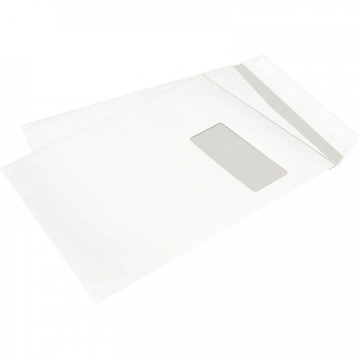Boite de 250 pochettes blanches 229x324mm 90g bande siliconée fenêtre 50x100mm.