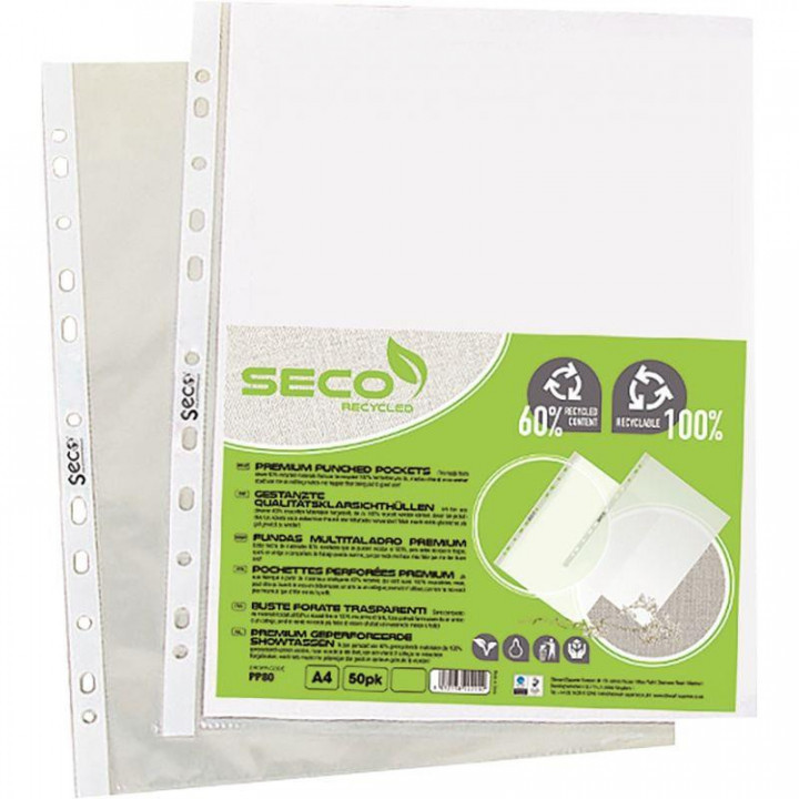 Sachet de 50 pochettes perforées en polypropylène recyclé 8/100ème. Polypropylène 8/100ème grainé, composé à 60% de matériaux recyclés. Les pochettes et leur emballage sont 100% recyclables. Même durée de vie qu’une pochette perforée PP classique. Pour format A4. Anti-transfert d'encre. Perforation 11 trous. Bande de perforation renforcée.